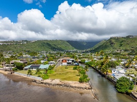 An aerial view of Ocean Villa Emilie reveals its private, elevated setting along the lush Honolulu hillside.