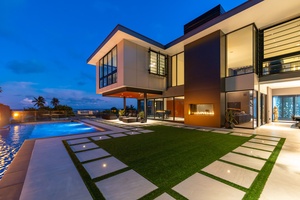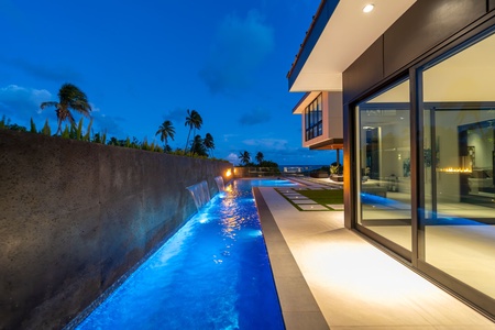 Ocean Villa Emilie illuminated at dusk—every detail designed for unforgettable evenings on Oahu.