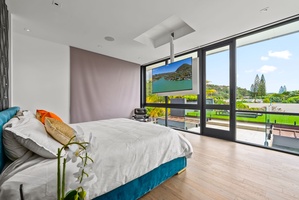 A queen bedroom with floor-to-ceiling windows, drop-down TV and tropical views—ideal for restful nights and breezy mornings.