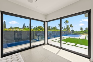 Slide open the glass doors and start your morning with views of lush lawns and the inviting lap pool just steps away.