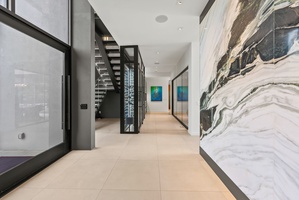 The entryway offers a warm welcome with high ceilings, organic textures, and sculptural lighting throughout.