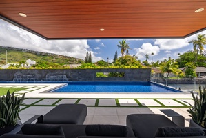 Lounge poolside beneath a sleek wood canopy, where modern design meets serene Hawaiian skies.