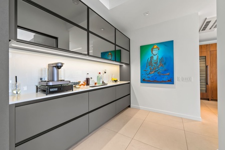 A sleek beverage corner with clean storage, perfect for personal chefs, coffee rituals, or early risers.