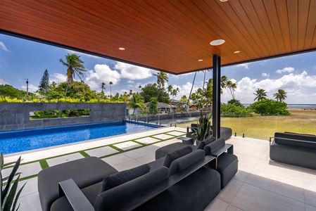 Resort-style comfort under the shaded lounge—designed for effortless indoor-outdoor living.
