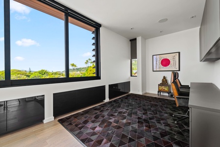 A flex space with custom shelving, ideal for work, creativity, or curling up with a favorite book.