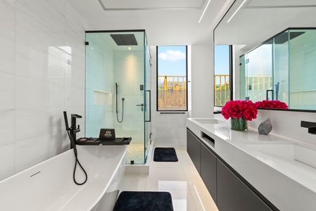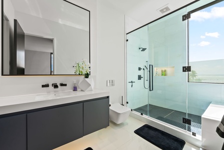 Ocean views and clean lines—this bathroom offers a resort-level spa experience from the comfort of home.