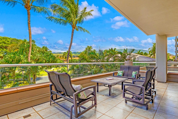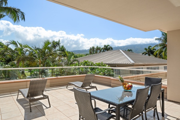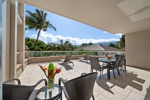 The expansive lanai at Honua Kai Konea 230/232 offers plenty of room to dine, relax, and enjoy the view
