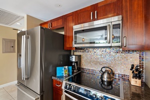 This kitchen in Honua Kai Konea 230/232 features a stylish backsplash and stainless steel appliances
