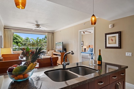 This open kitchen and living layout in Honua Kai Konea 230/232 keeps everyone connected.