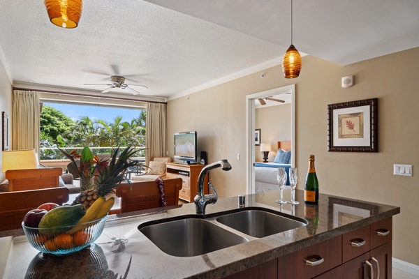 Honua Kai Konea 230/232 includes multiple prep areas and bar seating for casual meals or cocktails