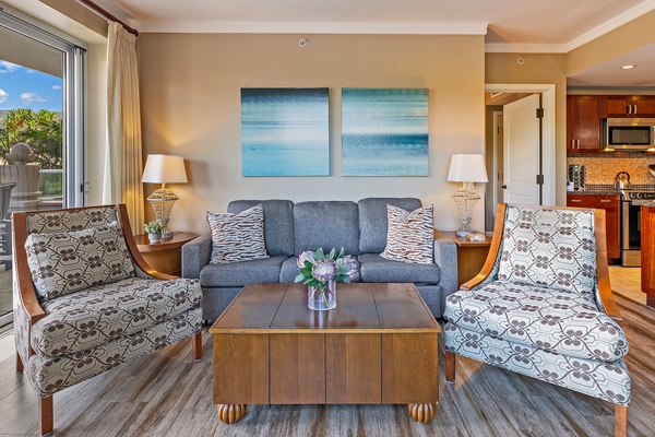Relax in Honua Kai Konea 230/232’s living room, featuring plush seating and tropical accents