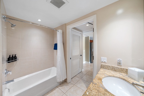 Full guest bath in Honua Kai Konea 230/232 includes granite counters and a shower/tub combo