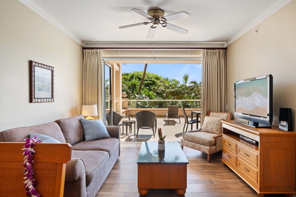 The living area in Honua Kai Konea 230/232 includes a queen sleeper sofa and easy lanai access