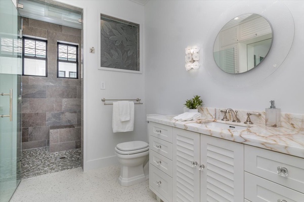 Beachy-modern bathroom with marble counters and walk-in shower.