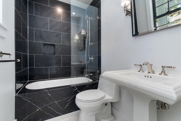 Elegant guest bath with marble tub surround, sleek vanity, and modern fixtures.