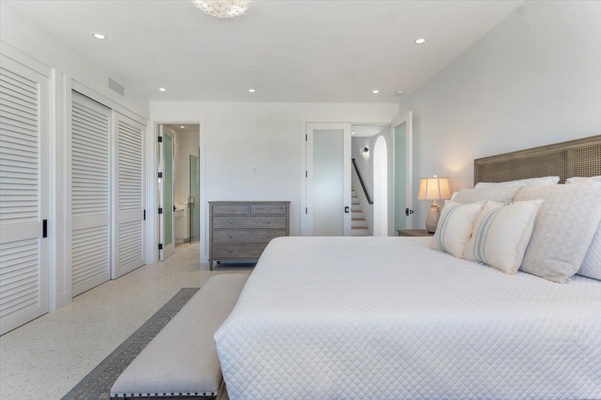 Spacious primary suite with a king bed, natural wood floors, and beachy elegance.