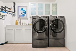 Sleek laundry room with premium washer and dryer plus custom storage cabinetry.