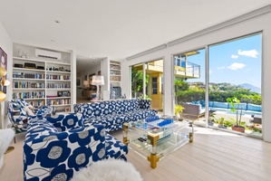 Colorful downstairs living space with ocean-view sliders and bold décor.