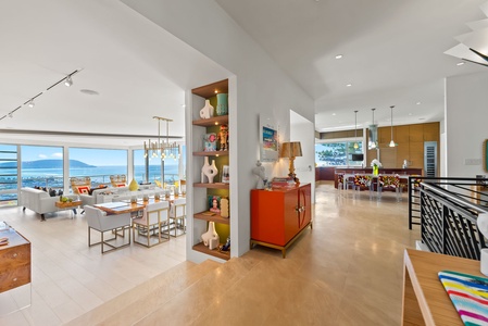 Bright hallway with curated shelving, modern lighting, and open views into the dining and kitchen areas.
