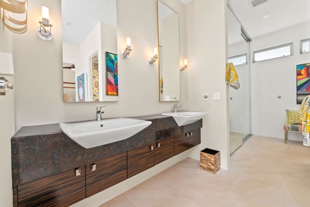 Primary bath with dual sink and vanity mirrors.
