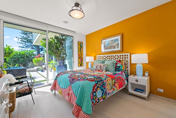 Guest suite with bold tropical tones, private lanai access, and ocean views.