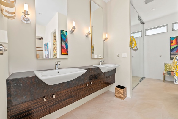 Bright and modern guest bathroom with double vanities and custom tile accents.