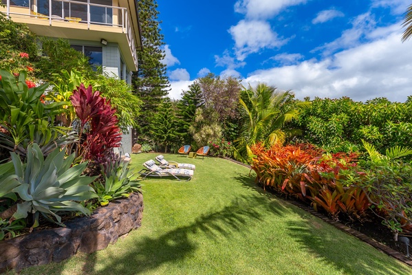 Wander through the vibrant garden paths or enjoy a peaceful moment on the sun-drenched lawn.