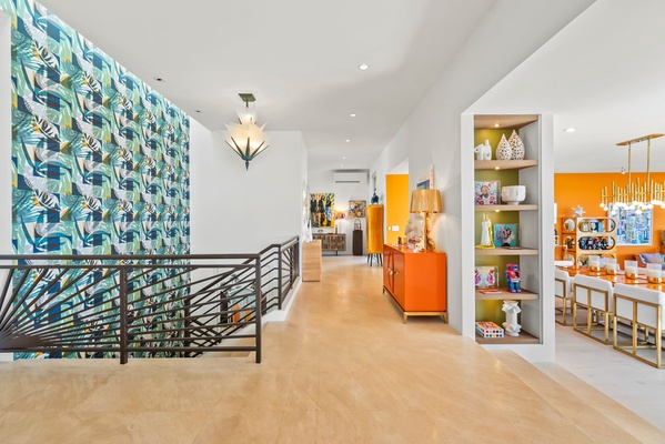 Spacious hallway with artistic wallpaper, bright natural light, and modern design touches.