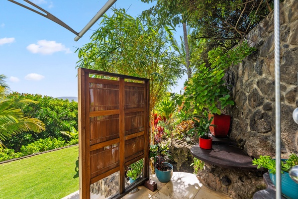 Surrounded by greenery, this open-air shower offers a refreshing, nature-connected experience.
