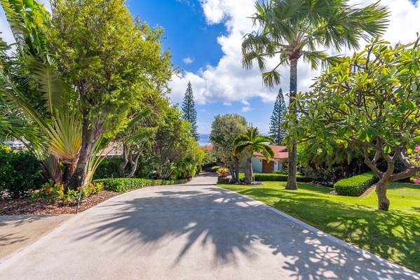 Tiered landscaping with tropical blooms surrounds the estate, adding lush privacy and color.