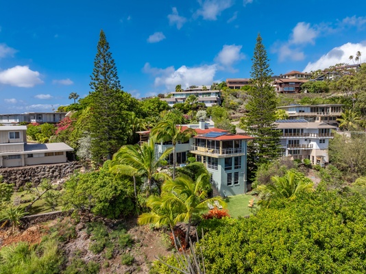 Pin-drop aerial highlights the home’s elevated setting and lush privacy above Honolulu.