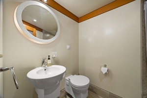 Step into your sleek bathroom featuring rich wood vanity, modern fixtures, and elegant stone textures creating a spa-like sanctuary for your stay.