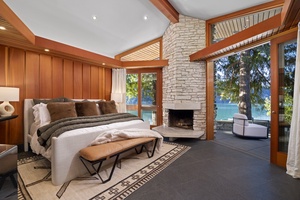 Relax in your luxurious bedroom featuring a cozy stone fireplace and panoramic lake views through floor-to-ceiling windows.