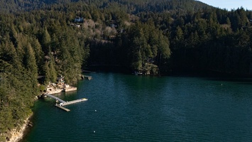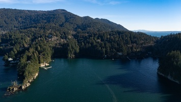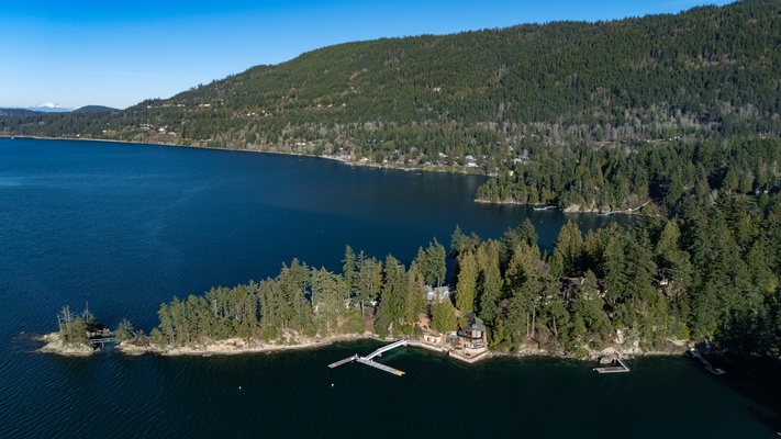 Stunning aerial perspective of a waterfront property nestled among pristine forested mountains overlooking crystal-clear lake waters.