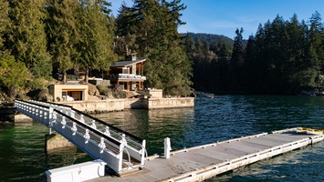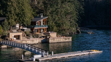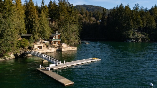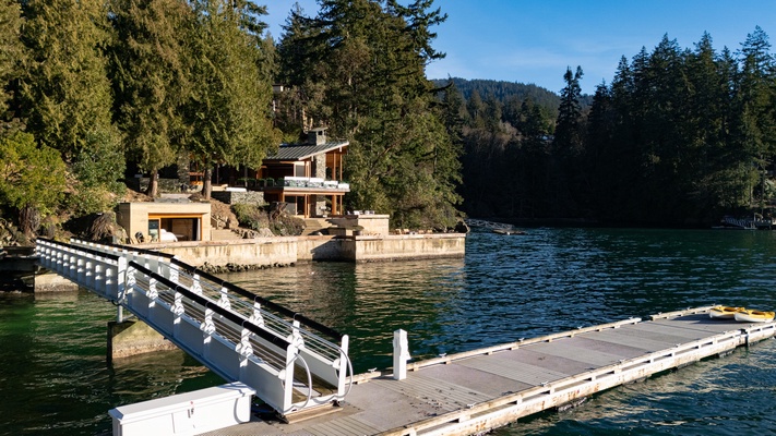 Modern waterfront retreat nestled among towering evergreens with private dock and terraced outdoor spaces overlooking pristine waters.