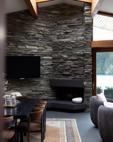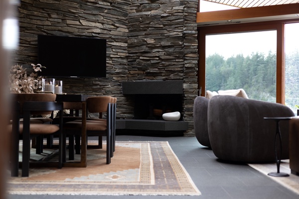 Unwind by your cozy stone fireplace while enjoying forest views through expansive windows in this stylish living space.