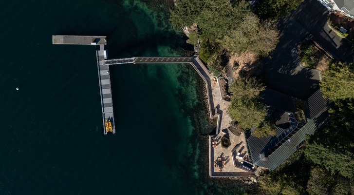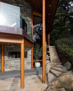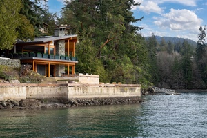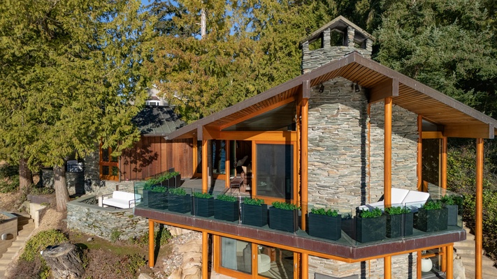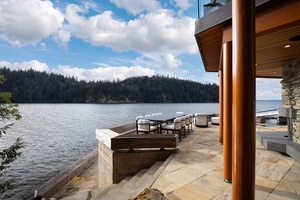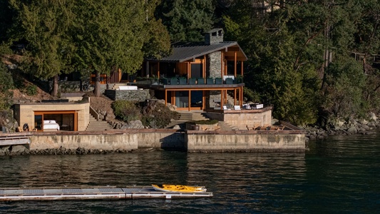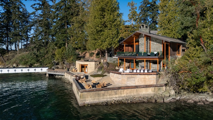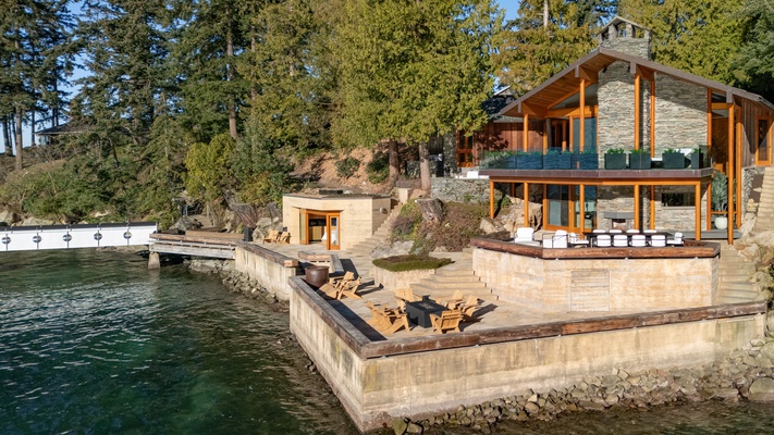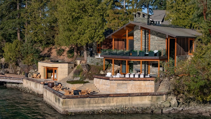 Modern waterfront property nestled among towering evergreens, featuring natural stone and warm wood accents with multiple outdoor terraces overlooking pristine waters.