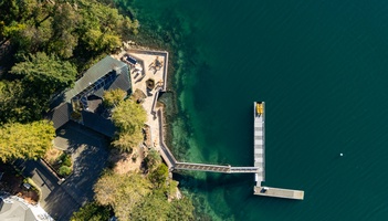 Waterfront terrace overlooking forested hills and peaceful lake waters.