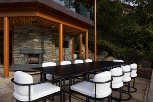 Gather around this stunning outdoor dining table where memorable meals unfold against a backdrop of natural stone and forest views.