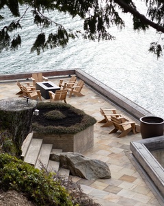 Expansive lakefront terrace features natural stone flooring, wooden outdoor furniture, and panoramic water views with forested islands stretching across the horizon.