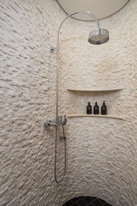 Luxurious curved stone shower with built-in shelf for your toiletries and rainfall showerhead for a spa-like experience.