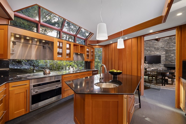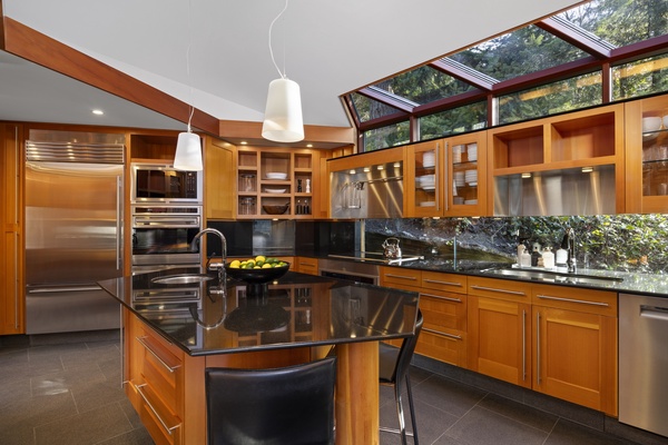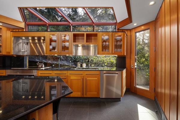 Your gourmet kitchen features rich wood cabinetry, granite countertops, and soaring ceilings with garden views through skylights.