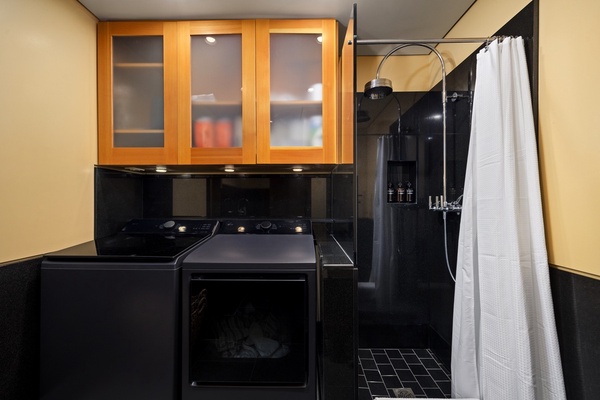 Your sleek studio combines modern kitchen and spa-like shower in one efficient space, perfect for culinary adventures and refreshing moments.