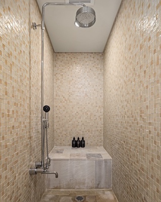 Step into your luxurious tiled shower with modern fixtures and built-in bench for pure relaxation.