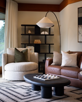 Unwind in your sophisticated living room with stunning lake and forest views through floor-to-ceiling windows.