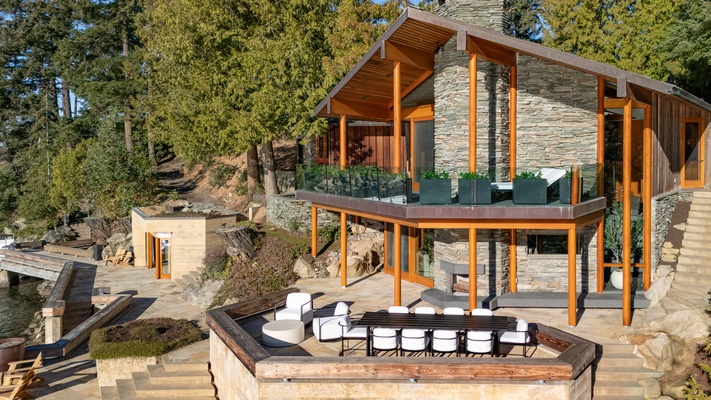 Modern lakefront property featuring stone and wood architecture with private dock and waterside seating areas.