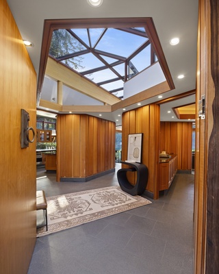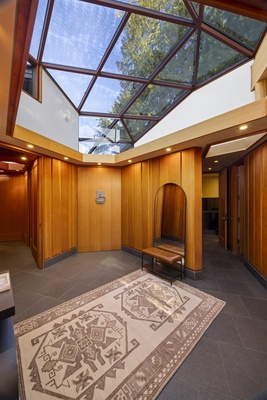 Step into this stunning wood-paneled foyer where natural light streams through the glass ceiling above, creating warmth throughout the space.