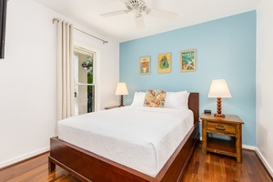 Drift off peacefully in your serene bedroom, where tropical artwork and soothing blue walls create the perfect coastal retreat atmosphere.
