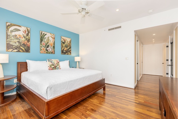 Unwind in your tropical-themed bedroom with crisp linens, vibrant artwork, and gleaming hardwood floors creating a serene retreat.