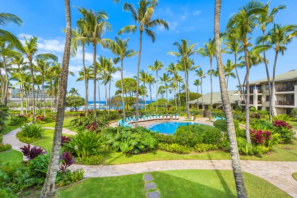 Tropical resort paradise with sparkling pool surrounded by swaying palms and lush gardens, steps from the ocean.